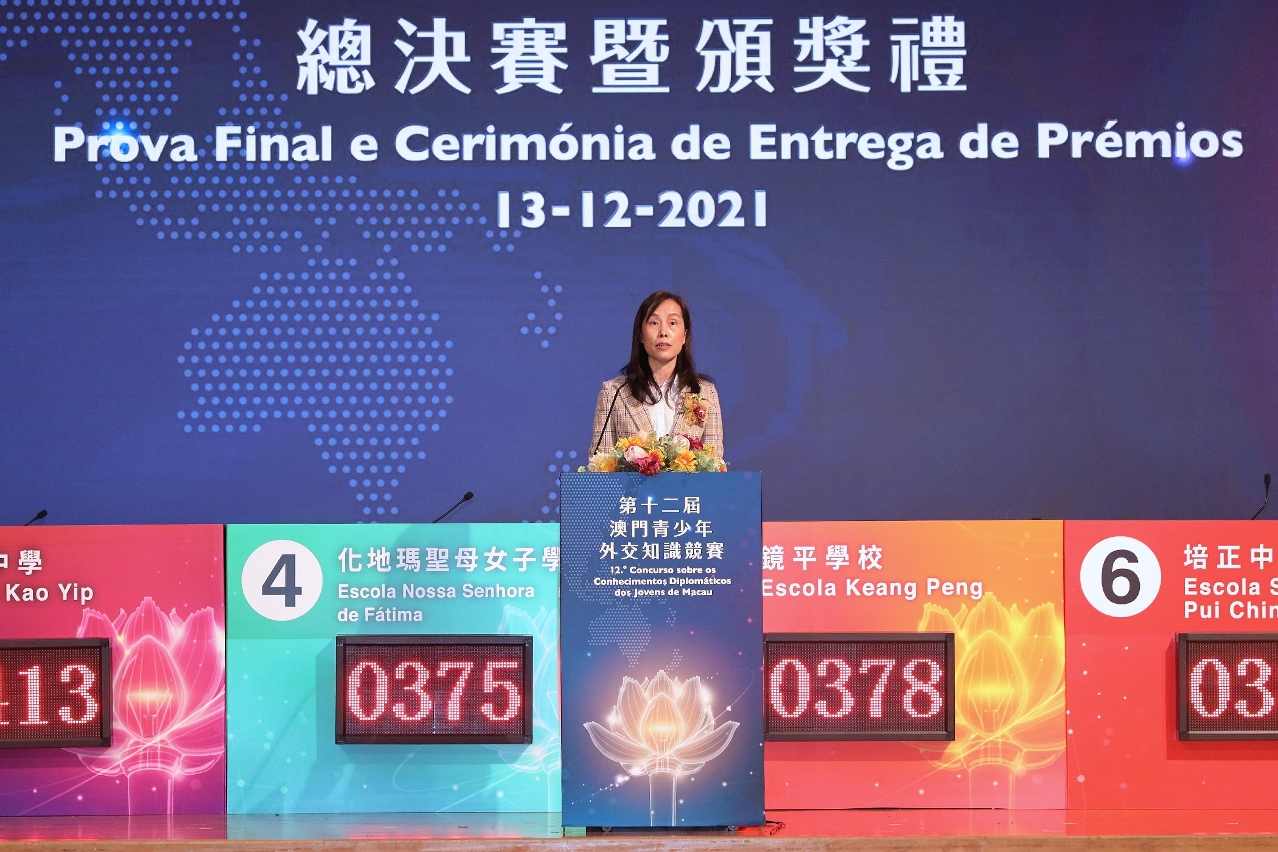 由澳门特别行政区政府与中华人民共和国外交部驻澳门特别行政区特派员公署主办、教育及青年发展局承办的第12届澳门青少年外交知识竞赛总决赛暨颁奖礼在12月13日成功举行。澳门青少年外交知识竞赛综合考验参赛学生对国家外交思想、中国特色大国外交、涉澳外交、外交史、外交常识、时政热点等的掌握和运用,得到特区社会各界广泛支持。