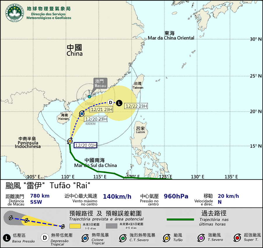 强台风「雷伊」已减弱为台风,目前集结在本澳西南偏南约 780 公里,正逐渐接近本澳。预料将在本澳以南约200公里内掠过。与「雷伊」相关的雨带会在20日至21日期间影响本澳,雨势会较为频密及持续时间较长,风力将间中达6级及有阵风。虽然「雷伊」强度会有所减弱,但由于路径较预期更接近本澳,请市民密切留意天气变化并关注最新风暴消息。