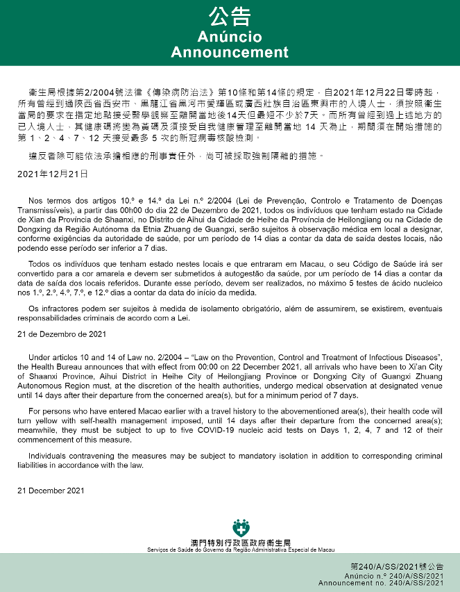 新型冠状病毒感染应变协调中心(下称“应变协调中心”)宣布,因应陕西省、黑龙江省及广西壮族自治区的疫情变化,自2021年12月22日零时起,所有曾经到过陕西省西安市、黑龙江省黑河市爱辉区或广西壮族自治区东兴市的入境人士,须按照卫生当局的要求在指定地点接受医学观察至离开当地后14天但最短不少于7天。而所有曾经到过上述地方的已入境人士,其健康码将变为黄码及须接受自我健康管理至离开当地 14 天为止,期间须在开始措施的第 1、2、4、7、12 天接受最多 5 次的新冠病毒核酸检测。免费核酸检测预约连结为https://app.ssm.gov.mo/mandatoryrnatestbook。核酸检测结果不会上载至澳门健康码亦不可作为出入境用途。如需将核酸检测结果在澳门健康码显示,则须自费检测。