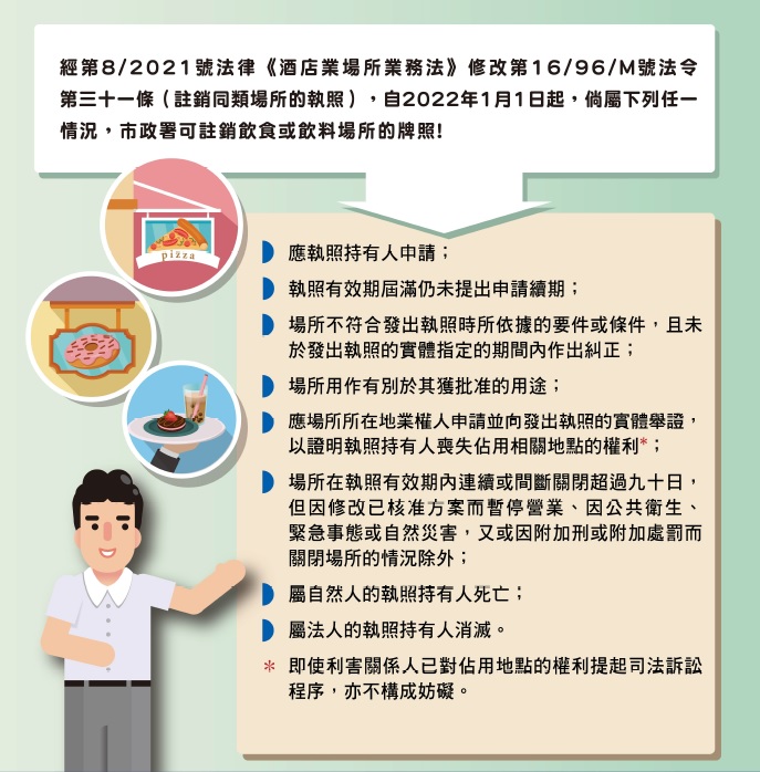 现时,市政署发出的饮食及饮料场所牌照受第16/96/M号法令所规范,根据有关法令第三十一条“执照之失效”指出,倘饮食或饮料场所关闭一年或一年以上,或执照在连续两年内不提出续期申请,将导致其牌照失效并取消。而明年起,根据第8/2021号法律《酒店业场所业务法》对上述条文作出了修改,规定“执照有效期届满仍未提出申请续期”、“场所不符合发出执照时所依据的要件或条件,且未于发出执照的实体指定期间内作出纠正”等八种情况,市政署可依法提起程序注销饮食或饮料场所的牌照。