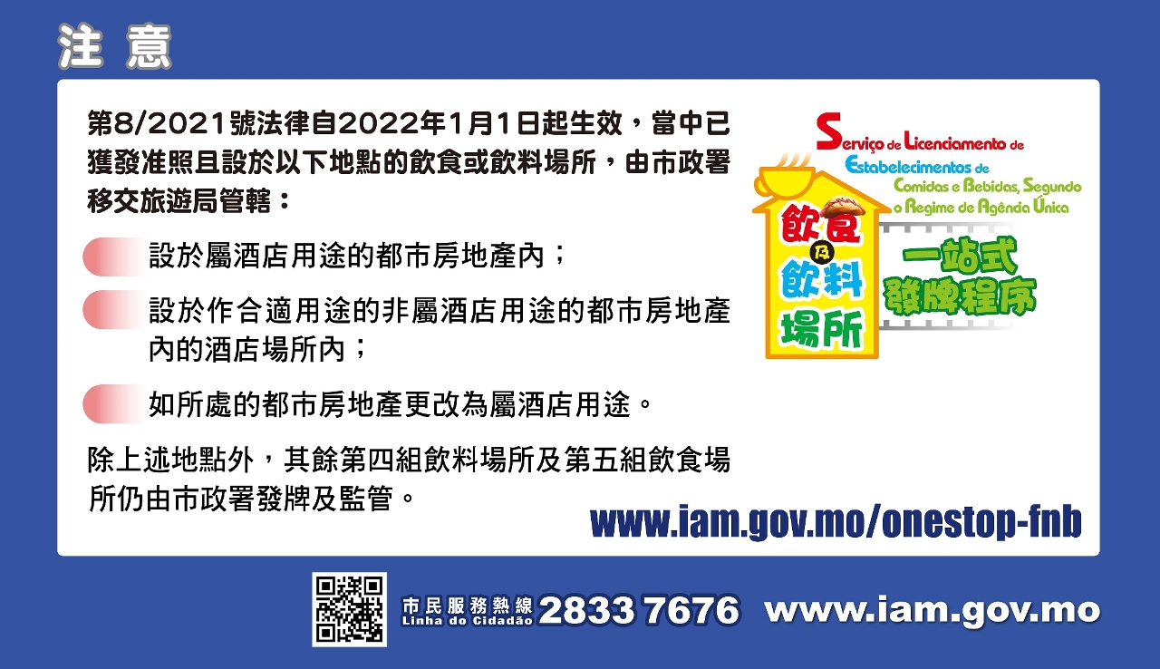 自2022年1月1日起,第8/2021号法律《酒店业场所业务法》正式生效,法律订明注销同类场所牌照的情况。市政署提醒各饮食及饮料场所持牌人须留意新法的相关规定,按牌照所示之应续期期间,主动向市政署提起续期申请,否则牌照可被注销。