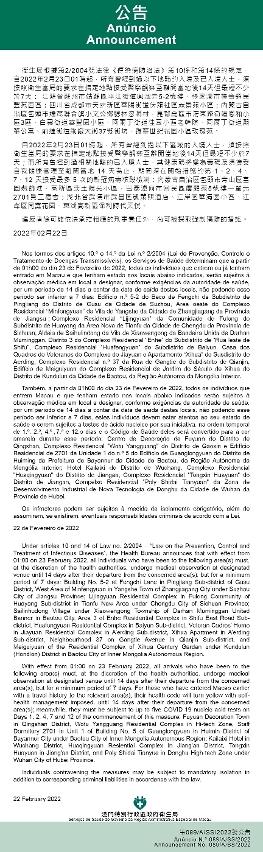 新型冠状病毒感染应变协调中心(下称应变协调中心)宣布,因应内地的疫情变化,卫生局根据第2/2004号法律《传染病防治法》第10条和第14条的规定,自2022年2月23日凌晨1时起,所有曾经到过以下地点的入境及已入境人士,须按照卫生当局的要求在指定地点接受医学观察至离开当地后14天但最短不少于7天:江苏省苏州市姑苏区平江街道凤池弄5-2号楼、张家港市杨舍镇民丰苑西区;四川省成都市天府新区华阳街道伏龙社区丽景苑小区;内蒙古自治区包头市达茂联合旗小文公乡腮林忽洞村,昆都仑区市府东路街道恩和小区3区、白云街道华丰园小区、阿尔丁街道佳园小区老干院、阿尔丁街道熙华公寓、前进街道钢铁大街37号街坊、锡华世纪花园小区玫瑰苑。