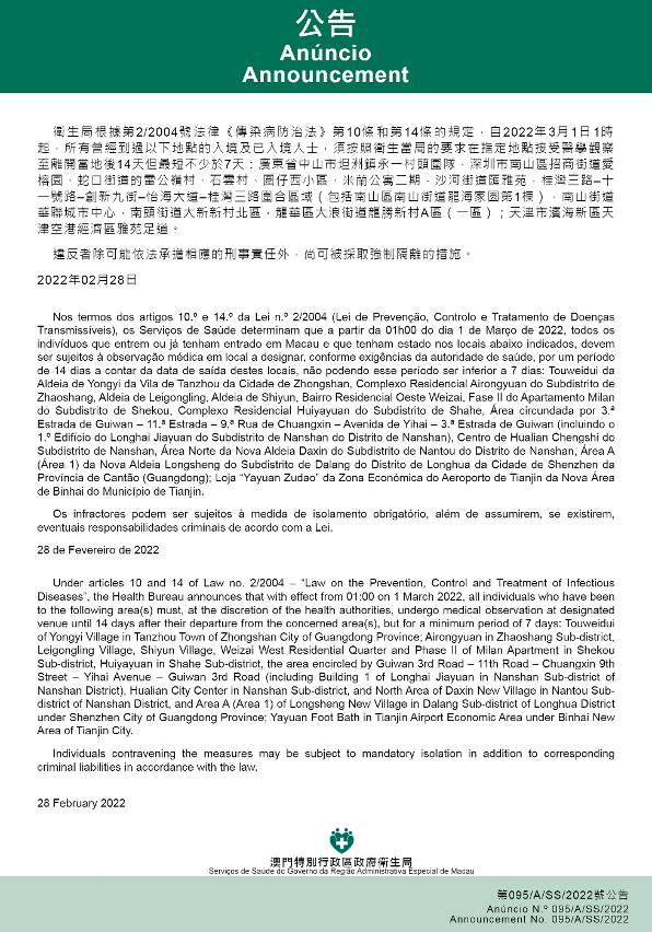 新型冠状病毒感染应变协调中心(下称应变协调中心)宣布,因应内地的疫情变化,卫生局根据第2/2004号法律《传染病防治法》第10条和第14条的规定,自2022年3月1日凌晨1时起,所有曾经到过以下地点的入境及已入境人士,须按照卫生当局的要求在指定地点接受医学观察至离开当地后14天但最短不少于7天:广东省中山市坦洲镇永一村头围队,深圳市南山区招商街道爱榕园、蛇口街道的雷公岭村、石云村、围仔西小区、米兰公寓二期,沙河街道汇雅苑,桂湾三路–十一号路–创新九街–怡海大道–桂湾三路围合区域(包括南山区南山街道龙海家园第1栋),南山街道华联城市中心,南头街道大新新村北区,龙华区大浪街道龙胜新村A区(一区);天津市滨海新区天津空港经济区雅苑足道。