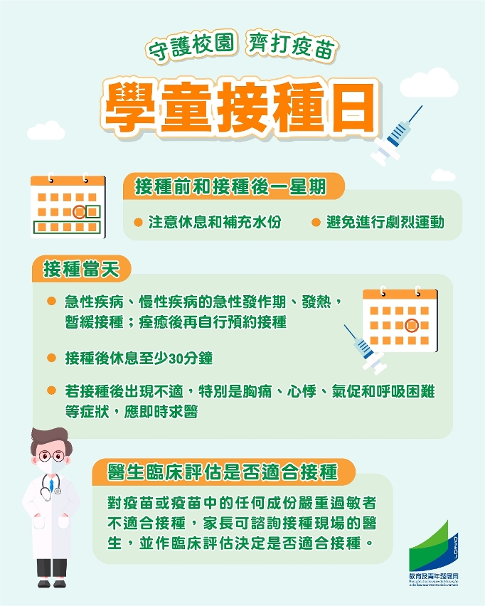 接种疫苗至少在两个星期后才令人体产生足够抵抗力, 教青局再次呼吁家长应尽快陪同3岁或以上的子女接种疫苗,保护子女的健康和生命安全。家长可登入卫生局预约系统(https://eservice.ssm.gov.mo/covidvacbook/) ,填妥资料后拣选群组“学童接种日”进行预约,并带备家长/法定监护人及子女的身份证明文件到现场即可接种。