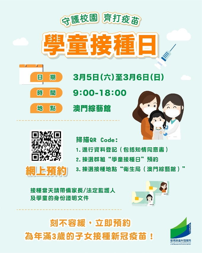 鉴于邻近地区疫情严重,更有儿童因感染新型冠状病毒而死亡或重症的个案,为应对本澳可能发生疫情的风险,保障儿童及青少年健康和生命安全,教青局与卫生局近日已陆续入校或于社区疫苗接种站安排专场,冀尽早为3岁或以上的学童接种新冠疫苗,考虑到家长陪同学生接种疫苗在时间上有不同需要,当局提供便利,将于本周六及日(3月5日及3月6日)早上9时至傍晚6时于综艺馆社区大型疫苗接种站举行“学童接种日”,并特别加大新冠疫苗接种预约额及服务安排等,目前反应踊跃,预约人数正不断增加。