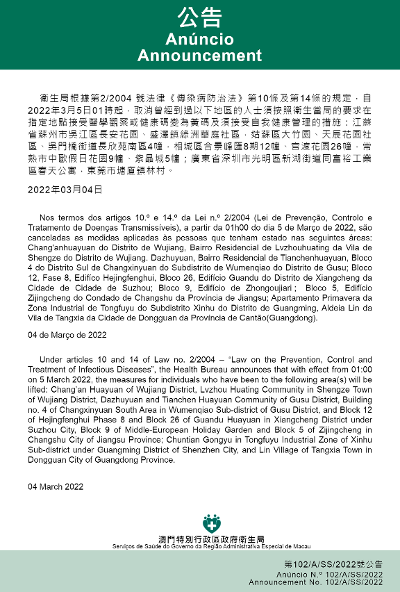 自2022年3月5日凌晨1时起,取消曾经到过以下地区的人士须按照卫生当局的要求在指定地点接受医学观察或健康码变为黄码及须接受自我健康管理的措施:江苏省苏州市吴江区长安花园、盛泽镇绿洲华庭社区,姑苏区大竹园、天辰花园社区、吴门桥街道长欣苑南区4幢,相城区合景峰汇8期12幢、官渡花园26幢,常熟市中欧假日花园9幢、紫晶城5幢;广东省深圳市光明区新湖街道同富裕工业区春天公寓,东莞市塘厦镇林村。