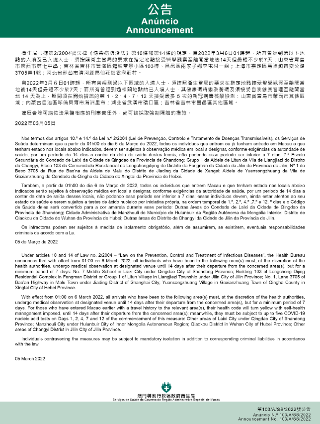 新型冠状病毒感染应变协调中心(下称应变协调中心)宣布,因应内地的疫情变化,卫生局根据第2/2004号法律《传染病防治法》第10条和第14条的规定,自2022年3月6日凌晨1时起,所有曾经到过以下地点的入境及已入境人士,须按照卫生当局的要求在指定地点接受医学观察至离开当地后14天但最短不少于7天:山东省青岛市莱西市第七中学;吉林市丰满区龙城帝景小区103栋、昌邑区两家子乡李屯村一组;上海市嘉定区马陆镇宝安公路3705弄1号;河北省邢台市清河县葛仙庄镇袁宋庄村。