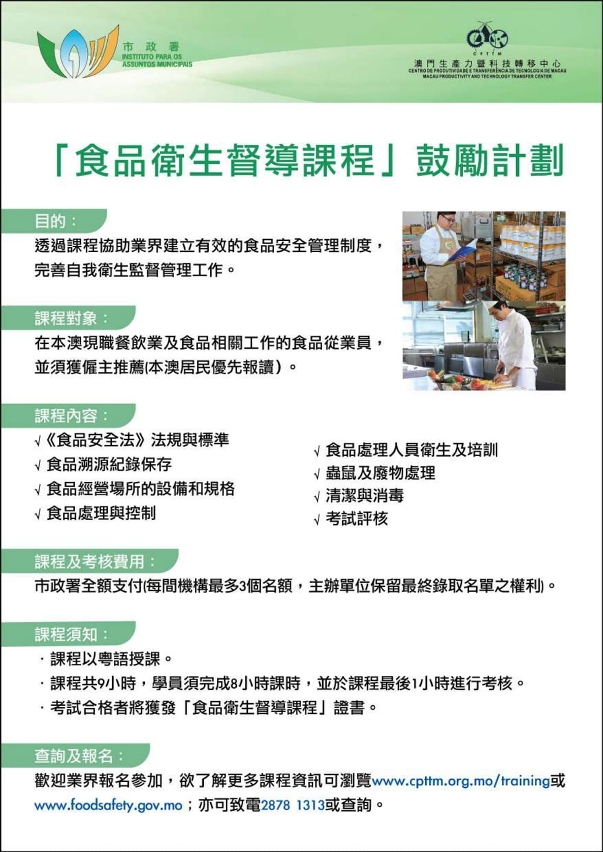 “食品卫生督导课程”由市政署与澳门生产力暨科暨转移中心合办,三月份课程分三日(三月二十一日、二十三日及二十八日)举行,课时合共九小时。对象为本澳现职餐饮业及食品相关工作的食品从业员,须由所属食品公司或场所之雇主推荐报读,每名雇主最多可推荐三名雇员。