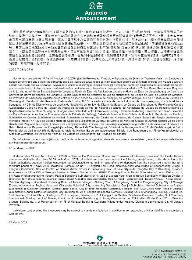 新型冠状病毒感染应变协调中心(下称应变协调中心)宣布,因应内地的疫情变化,卫生局根据第2/2004号法律《传染病防治法》第10条和第14条的规定,自2022年3月8日凌晨1时起,所有曾经到过以下地点的入境及已入境人士,须按照卫生当局的要求在指定地点接受医学观察至离开当地后14天但最短不少于7天:山东省青岛市莱西市龙口东路18号安居小区、龙水社区服务中心南龙湾庄自然村及焦格庄自然村、院上镇中心中学;广东省深圳市罗湖区南湖街道春风路2026-6号向西花园向贵楼6至23楼住宅,宝安区松岗街道沙浦洋涌工业区6路3号、燕罗街道罗田北区234号;广西壮族自治区防城港市防城区那良镇滩散村滩散街区域(和平路-解放路-口岸大街-新大街-沿边公路-解放路横街的区域);内蒙古自治区呼伦贝尔市满洲里市、包头市昆都仑区阿尔丁街道、前进街道、昆北街道、鞍山街道;上海市徐汇区徐家汇街道漕溪北路1200号;江苏省连云港市海州区龙河小区25号楼、众兴华庭7号楼、宝翔财富广场3号楼、极美苑2号楼、香溢世纪花城小区7号楼、悦城国际9栋、天景美地4号楼、九岭社区北大荒西21号、海连中路151号、温侨绿苑B2、润琦苑3号楼、许庄村杨圩北队75号。