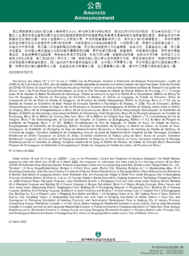 自 2022年3月8日凌晨1时起,取消曾经到过以下地区14天内的入境人士和已入境人士,应主动按第1、4、7天的时序接受核酸检测的措施:广东省珠海市高新区新冠疫情管控区(后环涌以东、唐淇路以西、绿巢环保科技公司侧(无名路)以北、海域以南划定范围)。