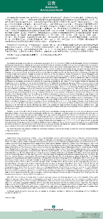 新型冠状病毒感染应变协调中心(下称应变协调中心)宣布,因应内地的疫情变化,卫生局根据第2/2004号法律《传染病防治法》第10条和第14条的规定,自2022年3月13日凌晨1时起,所有曾经到过以下地点的入境及已入境人士,须按照卫生当局的要求在指定地点接受医学观察至离开当地后14天但最短不少于7天:天津市河西区天塔街清海湾大众浴池;山东省德州市禹城市德州提艾斯科技有限公司(禹城市十里望镇禹王街北);甘肃省兰州市兰州新区秦川镇五道岘村、秦川镇振兴村三社,白银市景泰县上沙沃镇大桥村;河北省沧州市运河区天成郡府西区(1+2联合不动产中介办公所在小区);吉林省吉林市船营区新北街道张久村6社吉林市五福星肥业有限公司,蛟河市民主街道永安花园2号楼、新华大街新天地楼下大富豪金店一店,桦甸市横道河子乡文华村永安社;江苏省连云港市海州区;河南省濮阳市华龙区胜利路街道的盟城新区51号楼、濮水花园11号楼、吴越美容美发学校,孟轲乡玉兰花园西区嘉和逸景100号楼,清丰县大流乡苗屯村;广东省东莞市松山湖高新技术产业开发区阿里山路15号绿岛花园4栋、高雄路2号A栋和D栋、彰化路2号,广州市白云区萧岗东约大街一巷(10号、17号、17-2号、19号、19-1号、21号、23号、23-1号)、东约西街20号,白云区南至萧岗东约南街、东至萧岗东约西街第二排、西至东安居委旁停车场、北至东约西街一巷,海珠区穗花二巷1、2号漫豪思酒店公寓、穗花一巷4、7、8号,穗花二巷3、5、6、7号区域;云南省临沧市耿马傣族佤族自治县孟定镇孟定中意超市分店楼(整栋)、孟定诚信寄售行。