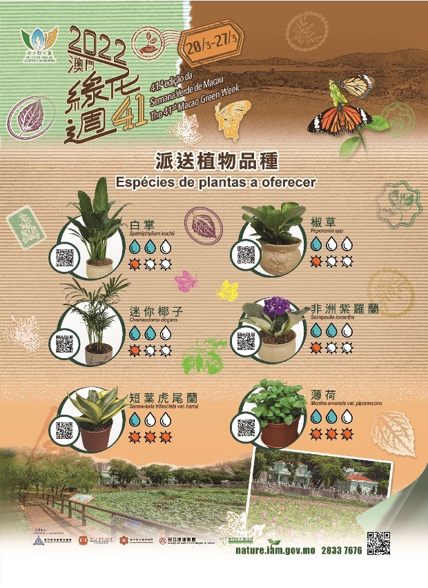 如欲了解更多绿化周的资讯,可浏览市政署网页www.iam.gov.mo、澳门自然网或澳门绿化周专题网页http://nature.iam.gov.mo/greenweek2022,或致电2833 7676、2888 0087查询。