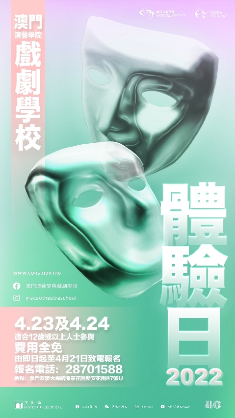 文化局辖下澳门演艺学院戏剧学校将于4月23日(星期六)及24日(星期日)举办“戏剧学校体验日2022”,活动由即日起开始报名,欢迎12岁或以上对戏剧有兴趣的人士参与。