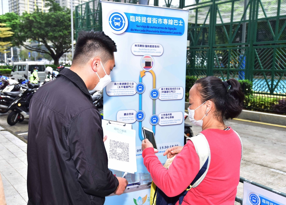 为让市民适应及方便到临时提督街市,市政署设专线巴士免费接载居民来回高士德区及临时提督街市。专线巴士于三月二十九日起营运,每天早上九时至中午十二时、下午三时三十分至下午六时三十分,沿途停靠高士德/连胜巴士站(太平电器门口)、观音堂前、士多鸟拜斯大马路华仁中心对面、高士德红街市巴士站(中国银行门口),再回到林茂塘街临时提督街市。另外,亦会加强巴士车箱的清洁消毒工作。专线巴士将先试行两个月,市政署将据乘搭人次等数据评估效益,再作调整安排。此外,临时街市外围亦设置了多个指示牌,指引市民前往。