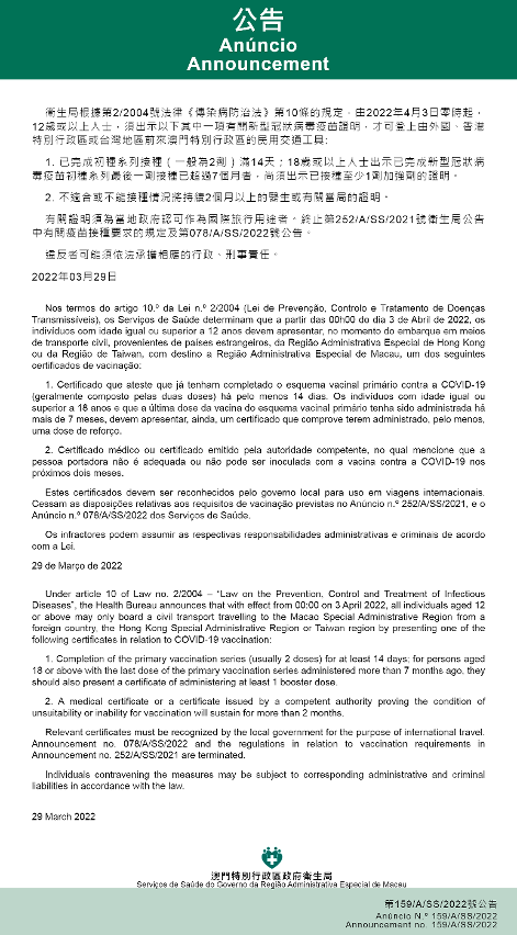 有关证明须为当地政府认可作为国际旅行用途者。终止第252/A/SS/2021号卫生局公告中有关疫苗接种要求的规定及第078/A/SS/2022号公告。违反者可能须依法承担相应的行政、刑事责任。