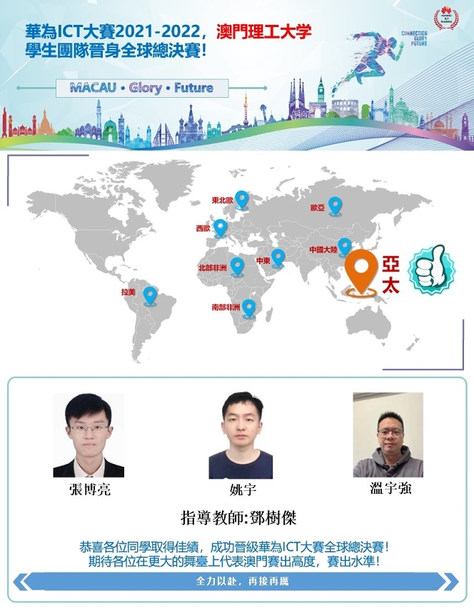 第六届华为ICT大赛在亚太区共吸引了286所院校5,300名学生的参与,经过澳门初赛、决赛、亚太区域赛的层层比拼及选拔后,共有27支网路赛道队伍和17支云赛道队伍于三月进行亚太地区赛。最终,澳门理工大学应用科学学院副教授邓树杰指导的学生温宇强、张博亮及姚宇组成的团队表现优秀,以亚太区网路赛道身份晋身全球总决赛,将全力以赴,代表澳门与来自西欧、拉美、非洲、中国内地、中东、欧亚区的队伍竞赛。
