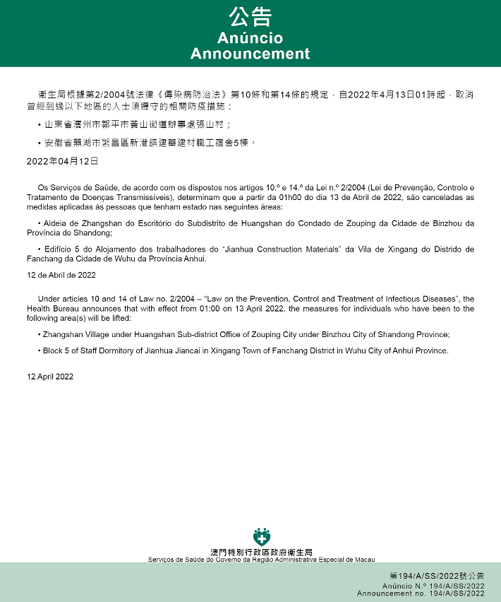 自2022年4月13日凌晨1时起,取消所有曾经到过以下地点的入境及已入境人士,须按照卫生当局的要求在指定地点接受医学观察至离开当地后14天但最短不少于7天的措施:山东省滨州市邹平市黄山街道办事处张山村;安徽省芜湖市繁昌区新港镇建华建材职工宿舍5栋。