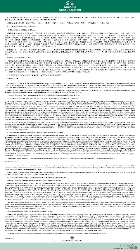 新型冠状病毒感染应变协调中心(下称应变协调中心)宣布,因应内地的疫情变化,卫生局根据第2/2004号法律《传染病防治法》第10条和第14条的规定,自2022年4月15日凌晨1时起,所有曾经到过以下地点的入境及已入境人士,须按照卫生当局的要求在指定地点接受医学观察至离开当地后14天但最短不少于7天:福建省宁德市蕉城区七都镇的三屿村、官亭村、贝河村、六都村、大厅村,八都镇的八都村、下坂村,漳湾镇郑岐村,金涵乡金涵村;河北省廊坊市安次区东沽港镇桃园村;黑龙江省牡丹江市爱民区拥军社区;广东省广州市海珠区的怀远后街、怀远新里、南田古道12号、岗街柏涛雅苑A区26-27号楼、新港街中大蒲园区693号楼、救国巷4号、46号、32号、30号;天河区员村二横路11号大院小区24栋、25栋;白云区的南湖山水庭苑G1栋、远泰物流、林安物流园警务室边的核酸检测点、本营大厦(上南路4号)、三元里大道1109号、1111号、1115号,白云区大沥路425号、427号、429号、431号、433号、435号、437号、439号、441号、443号、445号、447号、449号、451号、453号、455号、457号、459号、461号、463号和465号(商铺门牌号),白云区田心江中街三巷11号、12号、13号、14号,白云区东至梅隆水库管理处,南至梅隆水库坝下篮球场-林安牛津郡公寓-茶山东路,西至大源消防站-林安太和汇,北至大源六社罗屋;番禺区的钟村街钟韵路8号G栋(7天酒店)、市桥街德胜路218号(东沙别墅小区)6街1座、7街2号、8街1座、8街2号;南沙区龙穴街道龙穴岛启航路扬帆嘉园核酸采样点(扬帆嘉园B3栋);从化区东至福城路、南至富城路六巷、西至宝城北路、北至富城路的区域;荔湾区华贵路贵贤上品小区(荔湾区华贵路1-27号)。