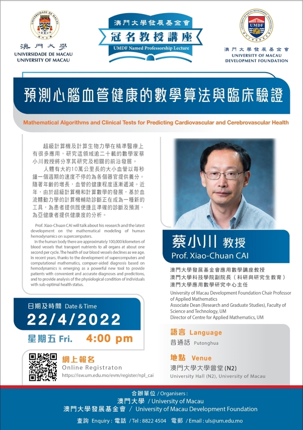 澳门大学将于4月22日(星期五)举办“澳门大学发展基金会冠名教授讲座”,由澳大发展基金会应用数学讲座教授蔡小川以“预测心脑血管健康的数学算法与临床验证”为题发表演说,探讨超级计算机及计算生物力学在精准医疗上的应用。
