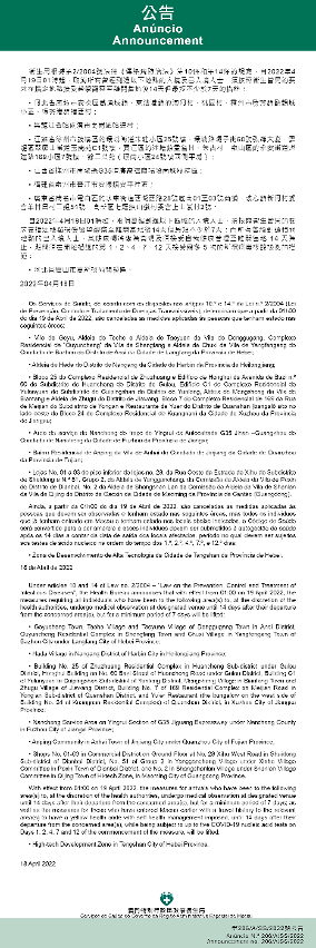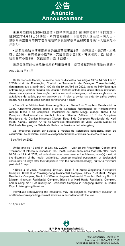 新型冠状病毒感染应变协调中心(下称应变协调中心)宣布,因应内地的疫情变化,卫生局根据第2/2004号法律《传染病防治法》第10条和第14条的规定,自2022年4月19日凌晨1时起,所有曾经到过以下地点的入境及已入境人士,须按照卫生当局的要求在指定地点接受医学观察至离开当地后14天但最短不少于7天:黑龙江省哈尔滨市南岗区的锦绣华城滨园3栋、学府星城小区7栋、印象城小区3栋、学府名居小区7栋、文汇家园小区1栋、电缆名苑小区1号楼、哈西华府小区8栋、旗凯丽园小区18号楼。