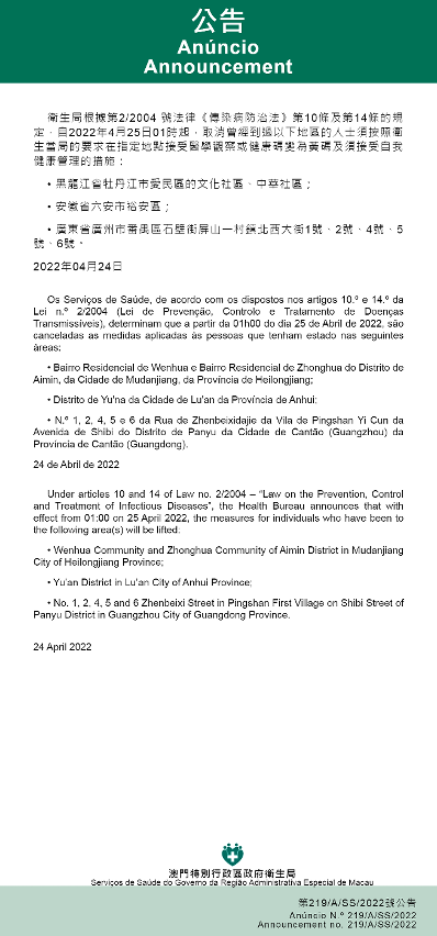 自2022年4月25日凌晨1时起,取消曾经到过以下地区的人士须按照卫生当局的要求在指定地点接受医学观察或健康码变为黄码及须接受自我健康管理的措施:黑龙江省牡丹江市爱民区的文化社区、中华社区;安徽省六安市裕安区;广东省广州市番禺区石壁街屏山一村镇北西大街1号、2号、4号、5号、6号。