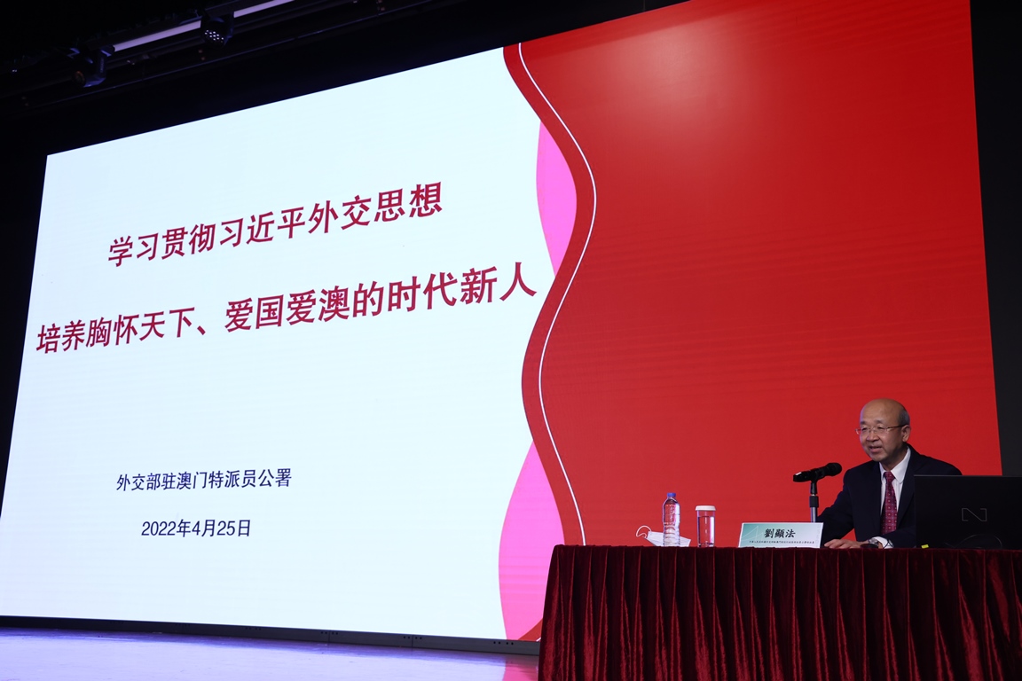是次讲座由中华人民共和国外交部驻澳门特派员公署特派员刘显法主讲,以“学习贯彻习近平外交思想——培养胸怀天下、爱国爱澳的时代新人”为主题,全面而深入地陈述了面对百年变局和世纪疫情,深入分析世界转型过渡期国际形势的演变规律。
