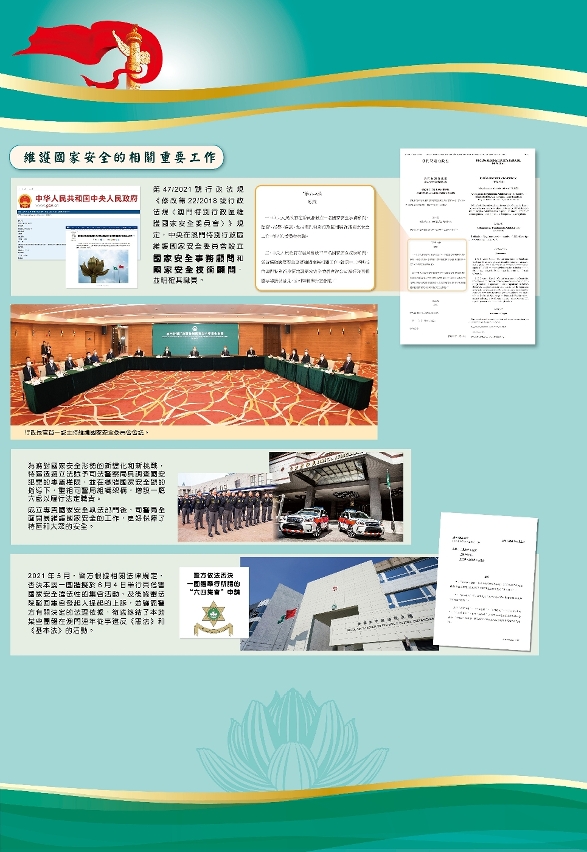 其中,在2021年12月22日,国家主席习近平与国务院总理李克强分别听取了行政长官贺一诚的述职报告,对行政长官和特区政府的工作给予了充分肯定。特区政府持续完善维护国家安全的法律体系,已实施了一系列国家安全相关的法律法规,并将修改《维护国家安全法》纳入了2022年的立法计划,同时,多部与维护国家安全相关的法律已进入立法程序或持续推进中。