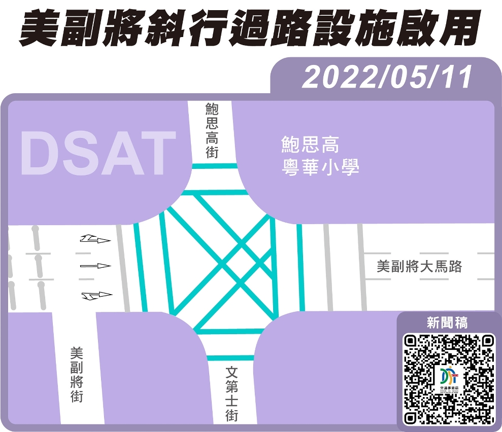 为持续优化本澳行人过路环境,经分析美副将大马路的道路条件及车辆通行压力,并听取周边学校之意见,交通事务局将于美副将大马路与鲍思高街及文第士街交界增设斜行式过路设施,并配合美副将大马路实施的 “智能响应监控(IRC)”交通灯区域配时,进一步方便学童及市民过路。有关设施5月11日(周三)上午完成地面标线及相应配套工作后,正式启用。