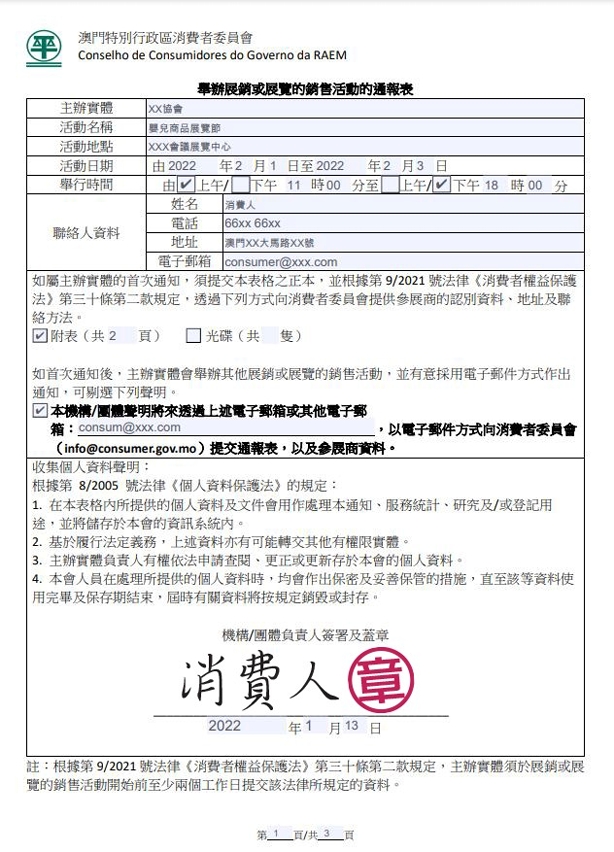 为协助业界履行法律规定的义务,消委会制作“举办展销或展览的销售活动的通报表”供业界使用,该通报表已载于消委会网页(www.consumer.gov.mo)内,讲座上详细介绍通报表须填写的资料及递交方法。