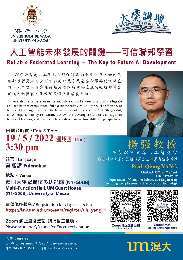 讲座将于5月19日(星期四)下午3时30分以普通话进行,并于澳大聚贤楼多功能厅(N1-G008)设有线下讲座及直播区,届时杨强将于线上与现场观众实时互动。有兴趣观看线上直播人士可登入网址https://umac.zoom.us/webinar/register/WN_i4RZyUxYTeWsftMn2fXACg。查询请致电8822 4504与钟小姐联系。