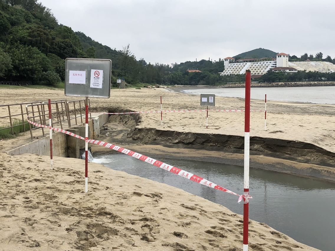 由于连日大雨,有大量的山水经由黑沙和竹湾海滩排入海,两个海滩的部分沙面有较多海沙被山水冲走,造成沙面有明显的高低落差,亦有部分位置的底层碎石露出,局方呼吁市民和游客注意有关情况,亦已在现场竖立告示牌及安排工作人员作出提醒,敬请市民注意安全。