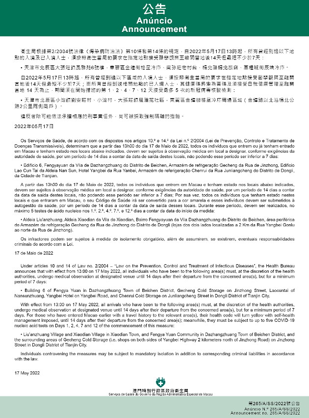 新型冠状病毒感染应变协调中心(下称应变协调中心)宣布,因应内地的疫情变化,卫生局根据第2/2004号法律《传染病防治法》第10条和第14条的规定,自2022年5月17日下午1时起,所有曾经到过以下地点的入境及已入境人士,须按照卫生当局的要求在指定地点接受医学观察至离开当地后14天但最短不少于7天:天津市北辰区大张庄镇风雅苑6号楼,东丽区金钟街格呈冷库、南孙庄老村台、杨北路杨北旅店、军粮城街辰瑞冷库。