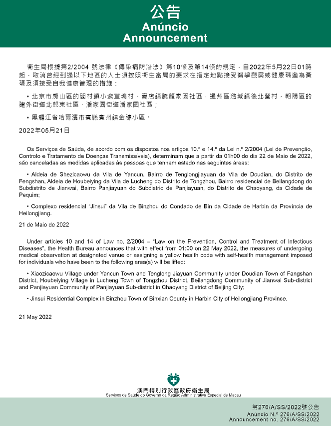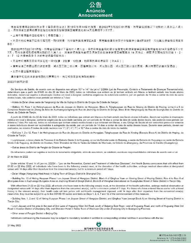 新型冠状病毒感染应变协调中心(下称应变协调中心)宣布,因应内地的疫情变化,卫生局根据第2/2004号法律《传染病防治法》第10条和第14条的规定,自2022年5月22日凌晨1时起,所有曾经到过以下地点的入境及已入境人士,须按照卫生当局的要求在指定地点接受医学观察至离开当地后14天但最短不少于7天: