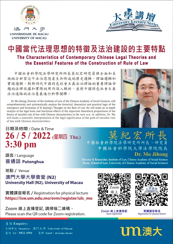 澳门大学将于5月26日(星期四)举办“大学讲坛”讲座,由中国社会科学院法学研究所所长、中国社会科学院大学法学院院长莫纪宏担任讲者,就“中国当代法理思想的特征及法治建设的主要特点”为题发表演说,探讨当代中国的法治思想和法治理论。