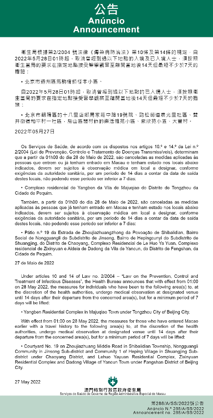 自2022年5月28日凌晨1时起,取消曾经到过以下地点的入境及已入境人士,须按照卫生当局的要求在指定地点接受医学观察至离开当地后14天但最短不少于7天的措施:北京市通州区马驹桥镇样本小区。