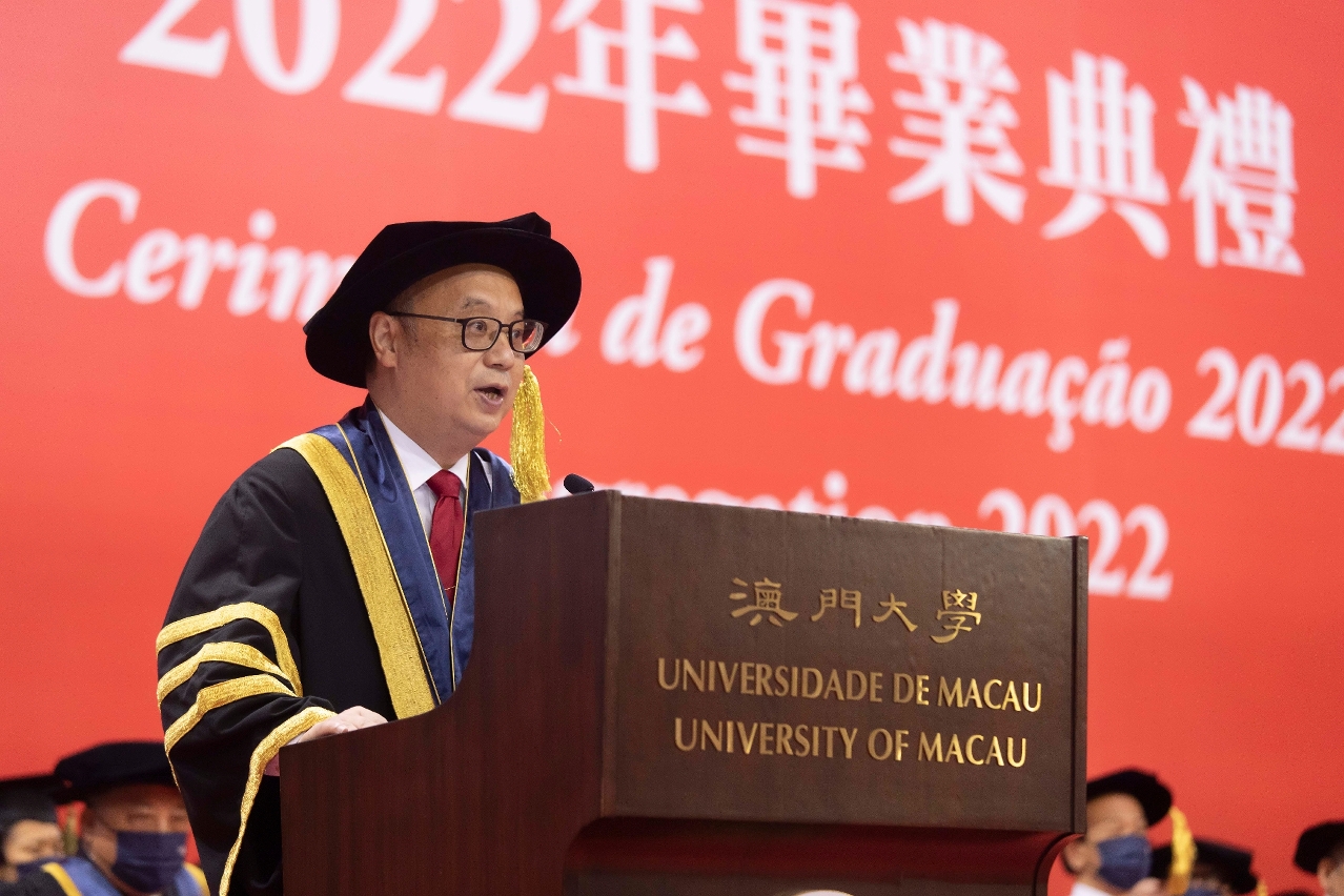 宋永华致辞时指,作为大学的管理者,自己必须在前所未有的困难面前承担起责任,尽全力在疫情下保障师生员工身心健康,让大学教研工作尽量顺利运行。同时配合国家和特区发展所需,持续完善人才培养体系,不断创新适应市场需求的科研创新及成果转化机制,全面加强大学的社会服务,合理高效地利用资源,积极推进澳大向前发展。这些努力得到全校师生的理解、响应、参与和支持,大学各项具体工作从未像现在这样让大家同气相求、携手并肩、攻坚克难。“这一份众志成城、戳力同心,令大学保持着良好的发展势头、国际声誉不断提升,也让我对澳门大学未来的发展更有信心!”此外,宋校长还向学生提出三点想法:第一,希望他们心怀正向,“疫”境自强。第二,希望他们勇于担当,甘于奉献,拒绝“躺平”。第三,希望他们拓宽视野,放大格局。