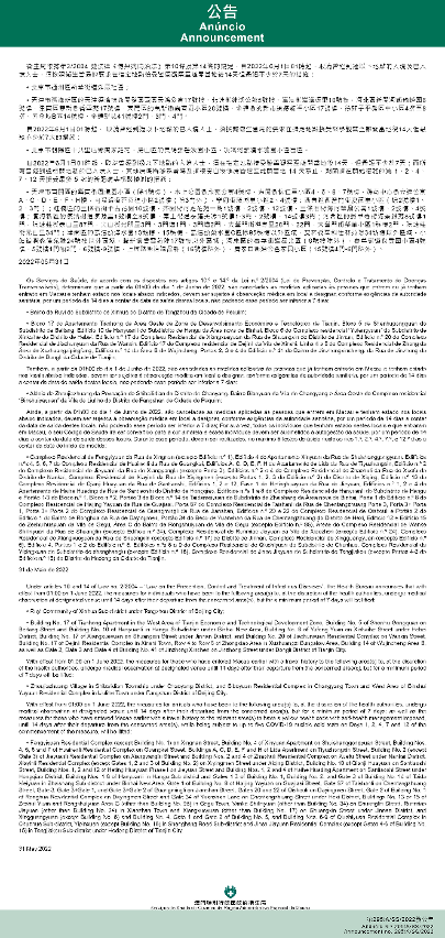 新型冠状病毒感染应变协调中心(下称应变协调中心)宣布,因应内地的疫情变化,卫生局根据第2/2004号法律《传染病防治法》第10条和第14条的规定,自2022年6月1日凌晨1时起,所有曾经到过以下地点的入境及已入境人士,须按照卫生当局的要求在指定地点接受医学观察至离开当地后14天但最短不少于7天: