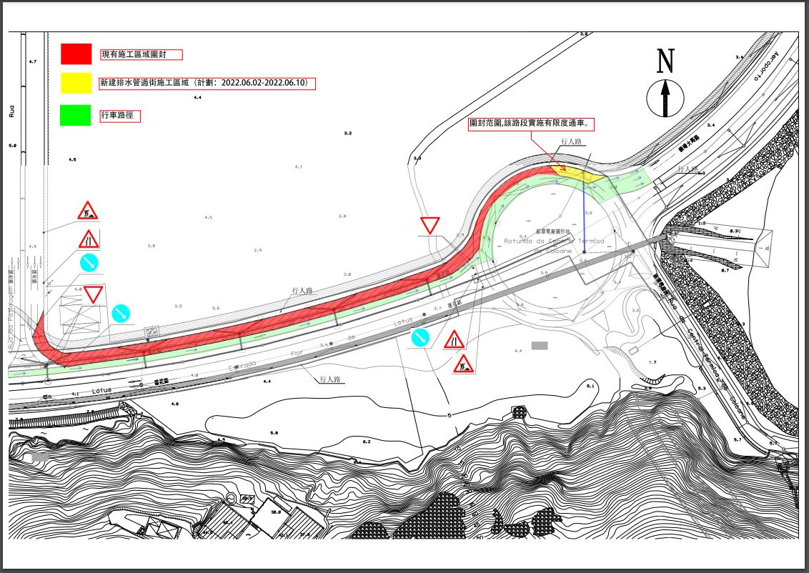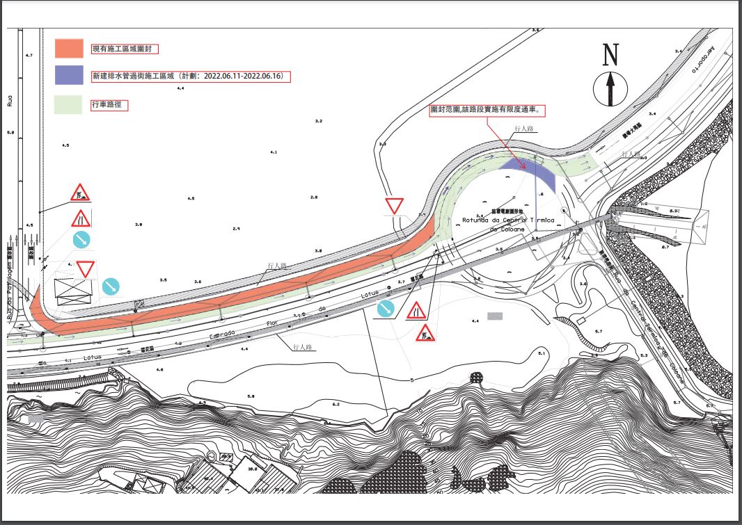 配合路氹城莲花路排水系统重整及新泵站建造的清水管过街工程施工,由2022年6月2日至2022年6月16日将分两阶段对路环电厂圆形地部分行车道进行围封施工,同时相关车道会作有限度通车(详见附图),敬请驾驶者遵守路上所设置之临时交通标志、服从交通警员之指挥及谅解是次改动所造成之不便。