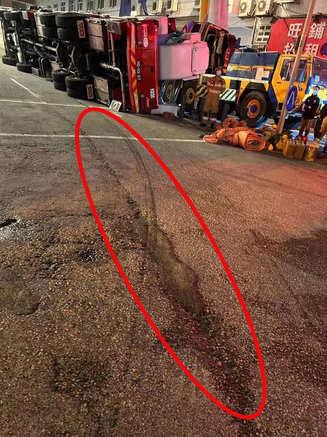 - 现场为一个呈“S”型的连续弯位,无论是救护车、水泵车、55米梯车,又或者是事故的68米平台车等,过往一直都能正常驶经该路段,亦没有发生过意外事故;