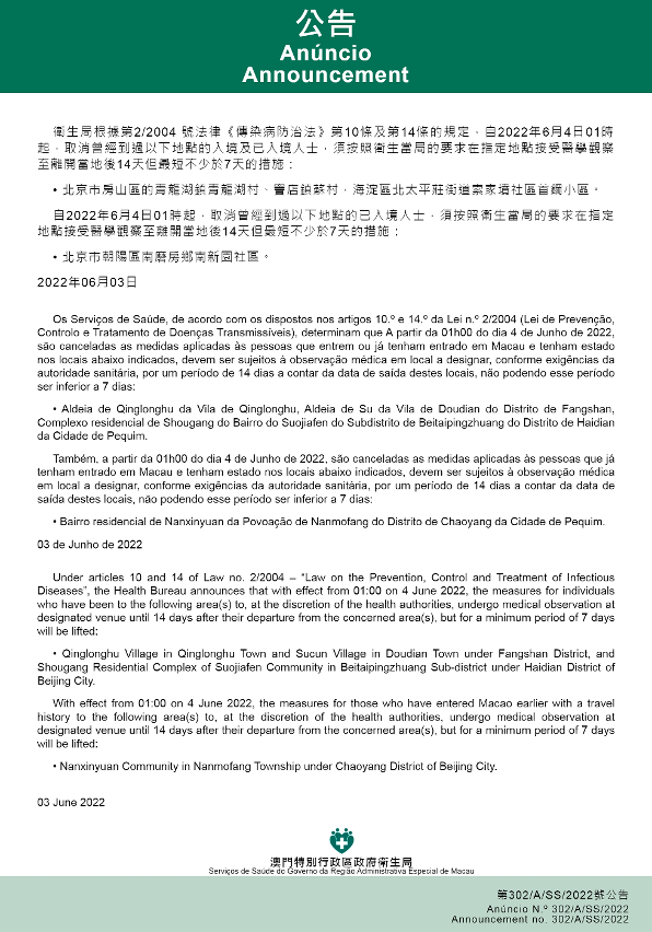 自2022年6月4日凌晨1时起,取消曾经到过以下地点的入境及已入境人士,须按照卫生当局的要求在指定地点接受医学观察至离开当地后14天但最短不少于7天的措施:北京市房山区的青龙湖镇青龙湖村、窦店镇苏村,海淀区北太平庄街道索家坟社区首钢小区。