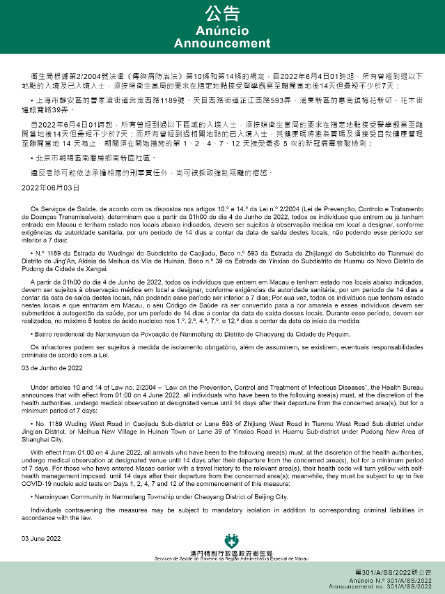 新型冠状病毒感染应变协调中心(下称应变协调中心)宣布,因应内地的疫情变化,卫生局根据第2/2004号法律《传染病防治法》第10条和第14条的规定,自2022年6月4日凌晨1时起,所有曾经到过以下地点的入境及已入境人士,须按照卫生当局的要求在指定地点接受医学观察至离开当地后14天但最短不少于7天:上海市静安区的曹家渡街道武定西路1189号、天目西路街道芷江西路593弄,浦东新区的惠南镇梅花新邨、花木街道银霄路39弄。
