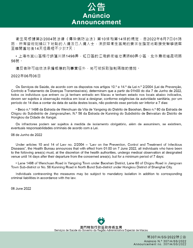 新型冠状病毒感染应变协调中心(下称应变协调中心)宣布,因应内地的疫情变化,卫生局根据第2/2004号法律《传染病防治法》第10条和第14条的规定,自2022年6月7日凌晨1时起,所有曾经到过以下地点的入境及已入境人士,须按照卫生当局的要求在指定地点接受医学观察至离开当地后14天但最短不少于7天:上海市宝山区杨行镇蕰川路1498弄,虹口区的江湾镇街道池沟路60弄小区、北外滩街道昆明路56号。