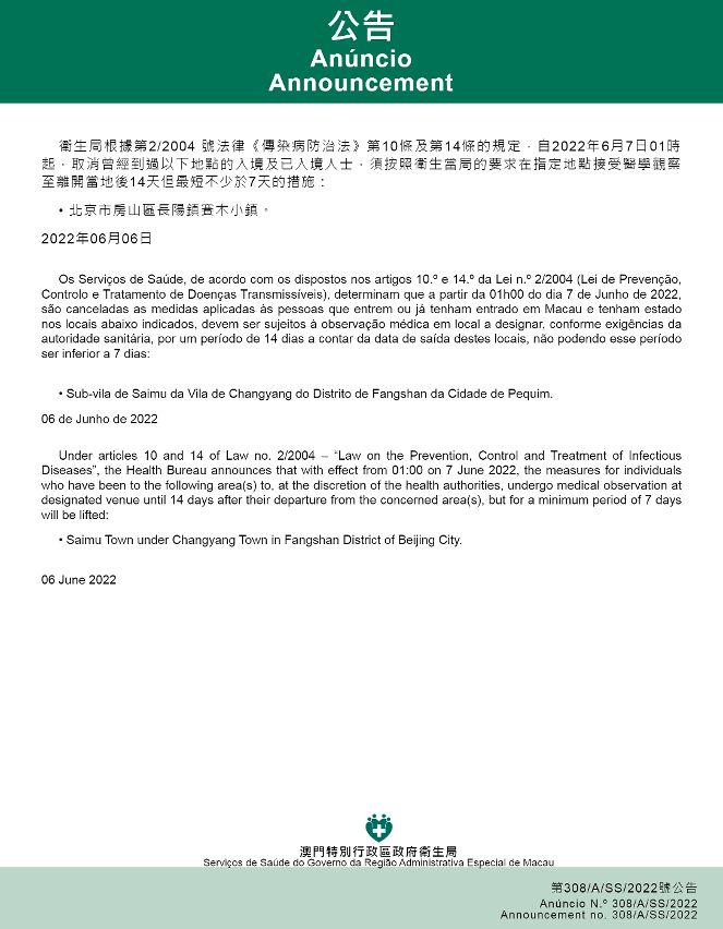 自2022年6月7日凌晨1时起,取消曾经到过以下地点的入境及已入境人士,须按照卫生当局的要求在指定地点接受医学观察至离开当地后14天但最短不少于7天的措施:北京市房山区长阳镇赛木小镇。
