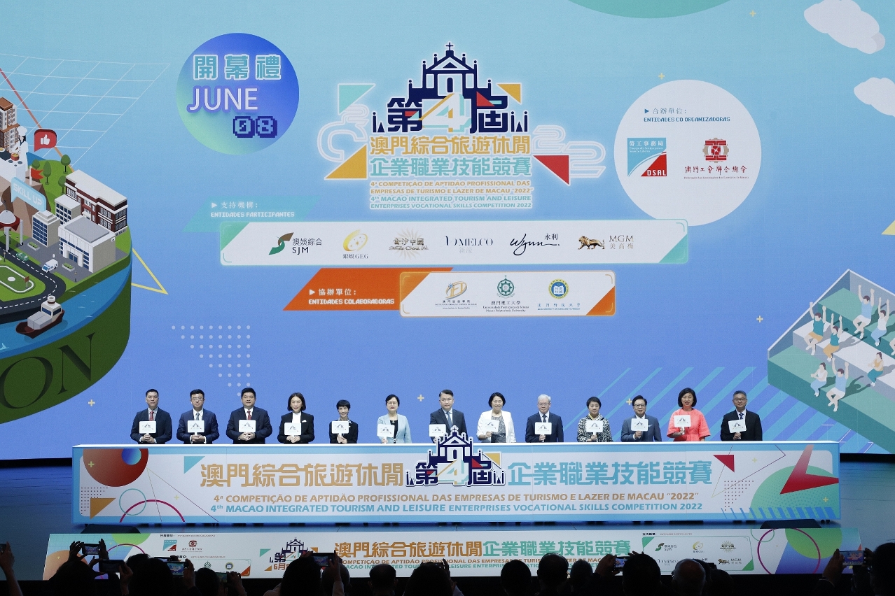 启动仪式由澳门特别行政区行政长官代表、经济财政司长李伟农,中央人民政府驻澳门特别行政区联络办公室副主任严植婵,广东省总工会副主席杜玲,劳工事务局局长黄志雄,澳门工会联合总会会长何雪卿,澳娱综合度假股份有限公司常务董事兼福咨会主席梁安琪,银河娱乐集团人力资源及行政集团董事吕慧玲,金沙中国有限公司总裁王英伟,新濠博亚娱乐有限公司首席顾问黄升雄,永利澳门有限公司副主席兼执行董事陈志玲,美高梅总裁及首席营运官王志琪,澳门劳工事务局副局长陈元童,第四届澳门综合旅游休闲企业职业技能竞赛筹委会主任蔡锦富主礼。劳工事务局局长黄志雄和工联总会会长何雪卿先后致词。