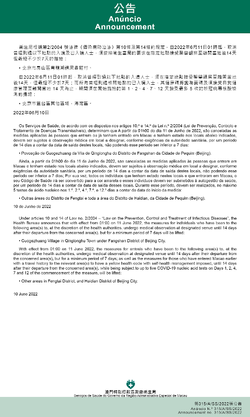 自2022年6月11日凌晨1时起,取消曾经到过以下区域的入境人士,须按照卫生当局的要求在指定地点接受医学观察至离开当地后14天但最短不少于7天;而所有曾经到过相关地点的已入境人士,其健康码将变为黄码及须接受自我健康管理至离开当地 14 天为止,期间须在开始措施的第 1、2、4、7、12 天接受最多 5 次的新冠病毒核酸检测:北京市丰台区其他区域、海淀区全域。