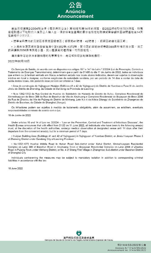 新型冠状病毒感染应变协调中心(下称应变协调中心)宣布,因应内地的疫情变化,卫生局根据第2/2004号法律《传染病防治法》第10条和第14条的规定,自2022年6月11日凌晨1时起,所有曾经到过以下地点的入境及已入境人士,须按照卫生当局的要求在指定地点接受医学观察至离开当地后14天但最短不少于7天:
