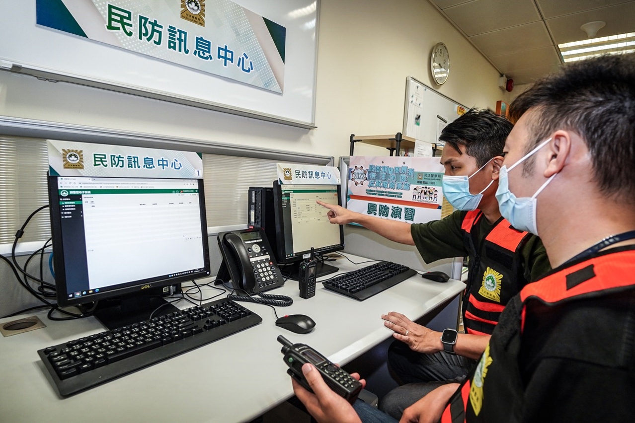 是次演习模拟因受台风侵袭并预计引发风暴潮,行政长官依法宣布本澳进入“即时预防状态”,民防架构按指示启动疏散撤离计划,司警局危机应变指挥中心根据撤离方案,指挥及协调各撤离小队前往所负责的区域执行撤离任务。