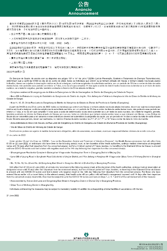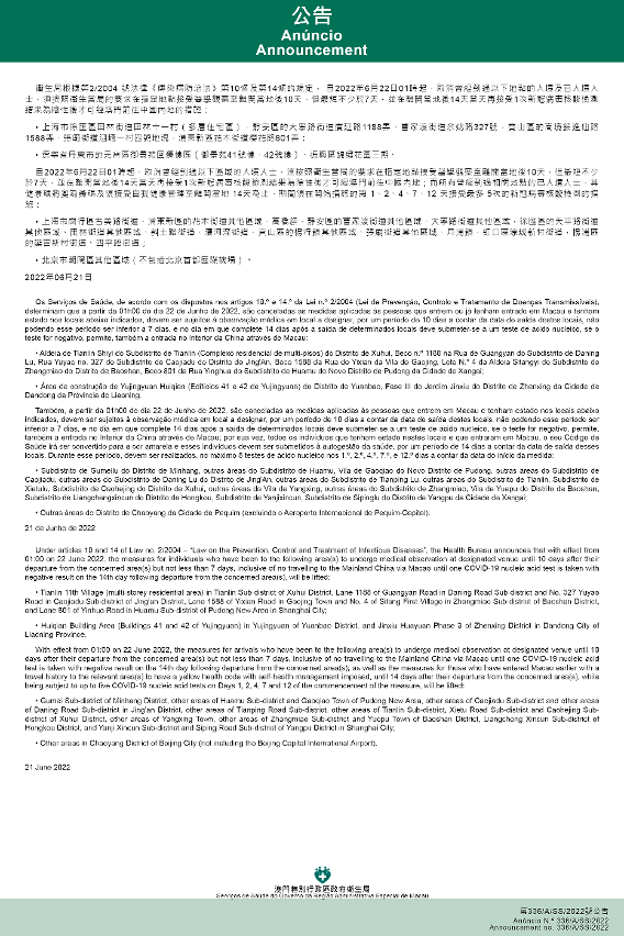 自2022年6月22日凌晨1时起,取消曾经到过以下地点的入境及已入境人士,须按照卫生当局的要求在指定地点接受医学观察至离开当地后10天,但最短不少于7天,并在离开当地后14天当天再接受1次新冠病毒核酸检测结果为阴性后,才可经澳门前往中国内地的措施: