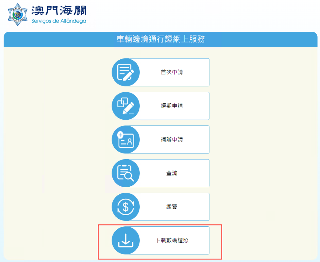 符合资格的车主可如常透过「车辆边境通行证网上服务」作出申请(连结:https://eservice.customs.gov.mo/carpass),或前往澳门海关辖下的申请地点办理「车辆边境通行证」的申请手续,待有关申请获批后会以短讯形式作出通知,车主可点击短讯内之连结,透过网上下载「车辆边境通行证数码证照」之电子檔,保存到手机或列印存放于车上,以备有需要时供海关检查。