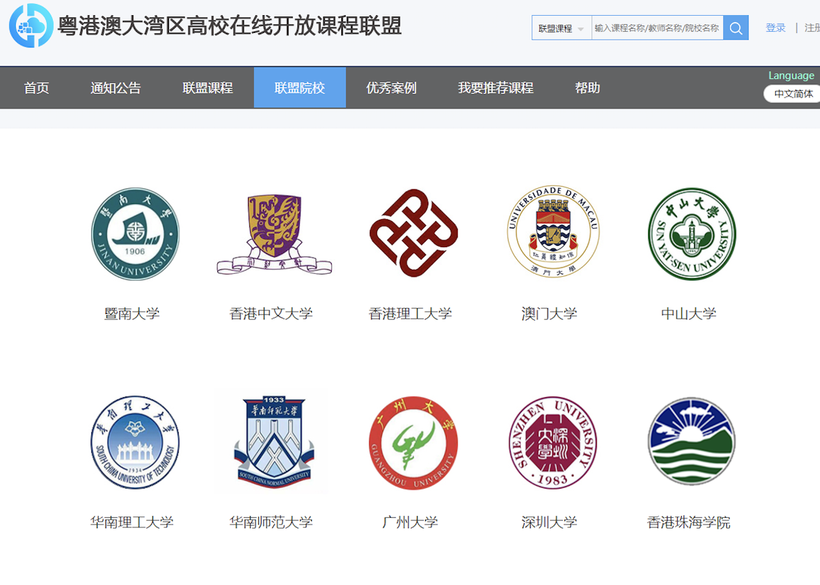粤港澳大湾区高校在线开放课程联盟成立于2018年,主要开展各类优质在线开放课程建设,建设互联互通的在线开放课程平台,为社会公众免费提供科学、文化素质教育等在线开放课程。联盟内高校可以免费享受联盟平台上所有在线开放课程及相关资源、平台软件支持服务、学校专属人员服务,参与联盟组织的各类教师发展培训活动、课程建设沙龙、相关评优比赛等。